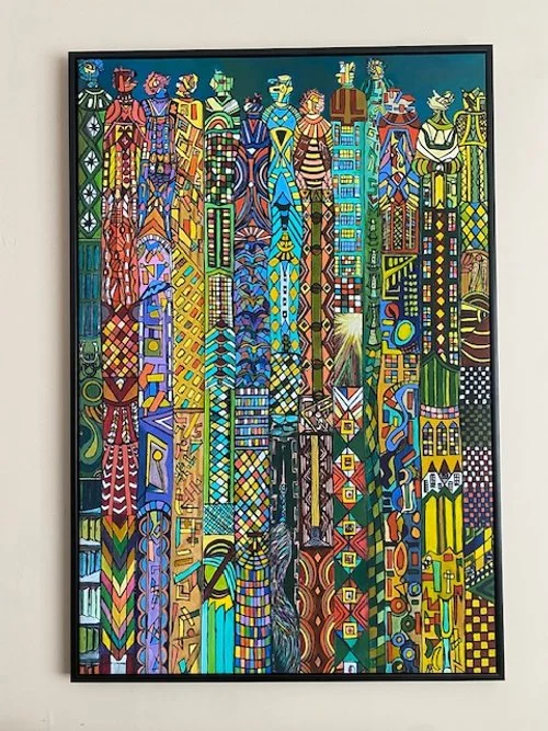 I reached my potential in the vein of Ceramics and began to search for a new channel for art; this was fulfilled in acrylic paintings. Evolving from organic doodling to large scale detailed design and construction. I used cityscapes and global art as inspiration for my work.
